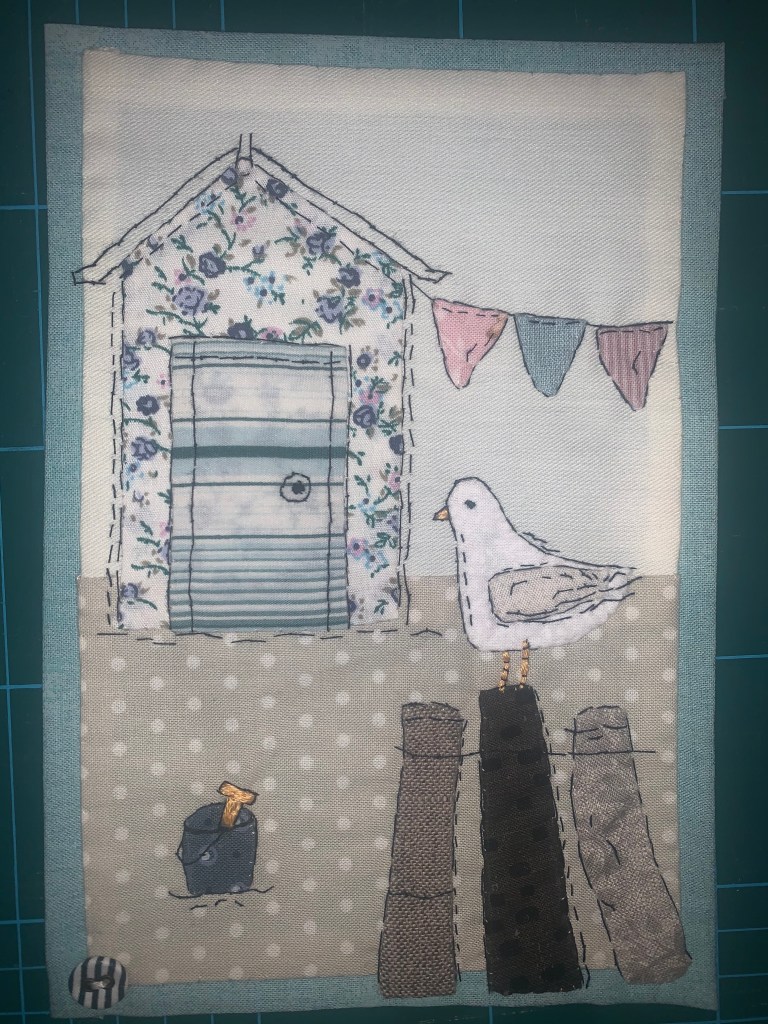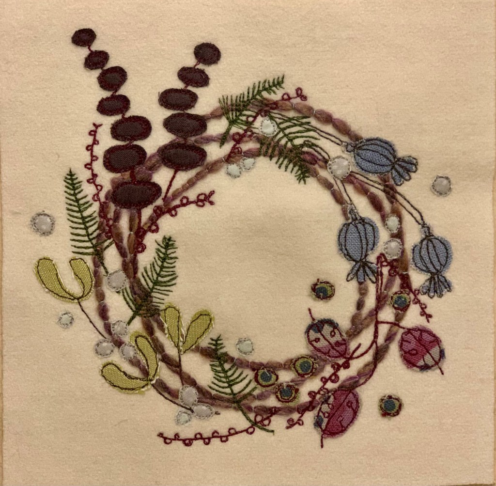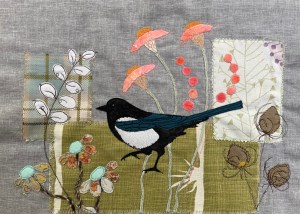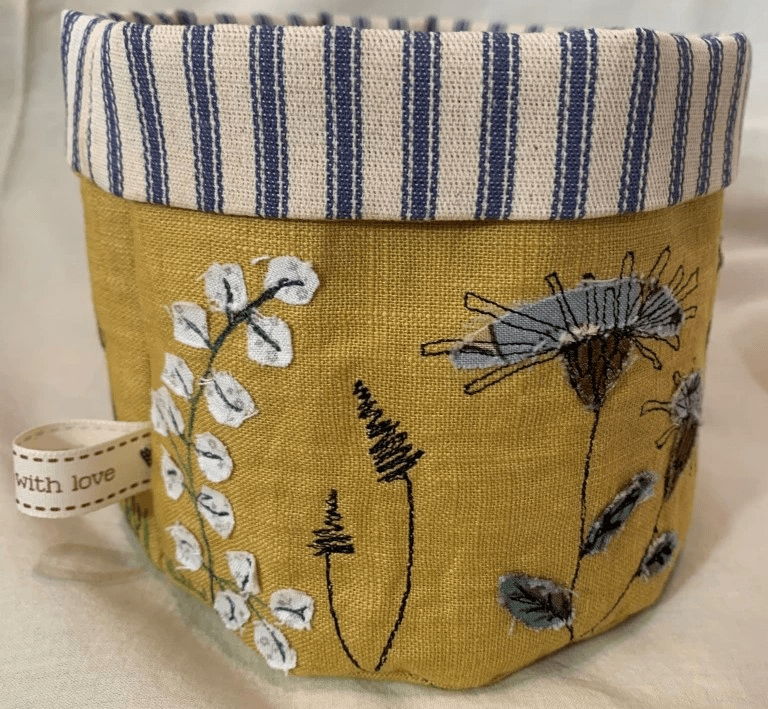 The background for the magpie was my first attempt at collage and I love the result.This wreath is much admired and I have incorporated the design into cushion covers for several clients. It was inspired by the textile artist, Jo Hill.I have developed a range of storage tubs incorporating my free motion art.This mini wall hanging combines everything I love about the sea; sailing, gathering flotsam in the dunes and spotting sea-birds. It won first place in a patchwork exhibition.