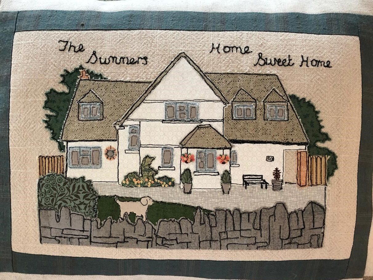 Inspired by a garden ornament in my father’s garden. This was an early attempt at free motion machine appliqué.This cushion cover was developed for a client from a photograph of their home. I have begun to enjoy adding background colour by using paint.